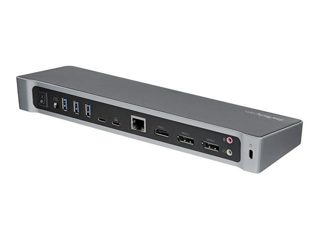 Cette station d'accueil triple-4K pour les ordinateurs portables USB-C Mac, Windows et Chrome fait passer la productivité à la vitesse supérieure. Avec trois connexions vidéo 4K, Power Delivery 100 W et 5 ports USB 3.0, la station d'accueil USB-C est parfaite pour votre MacBook, Dell XPS, Chromebook ou tout autre ordinateur portable USB-C nécessitant des ports supplémentaires. Vous pouvez également connecter la station d'accueil à votre ordinateur portable USB 3.0 à l'aide d'un port USB-A et d'un câble USB-C vers USB-A, tel que le "USB315AC1M" (vendu séparément). Remarque : la charge de votre ordinateur portable par Power Delivery n'est pas disponible par USB-A et seul le double affichage est pris en charge.